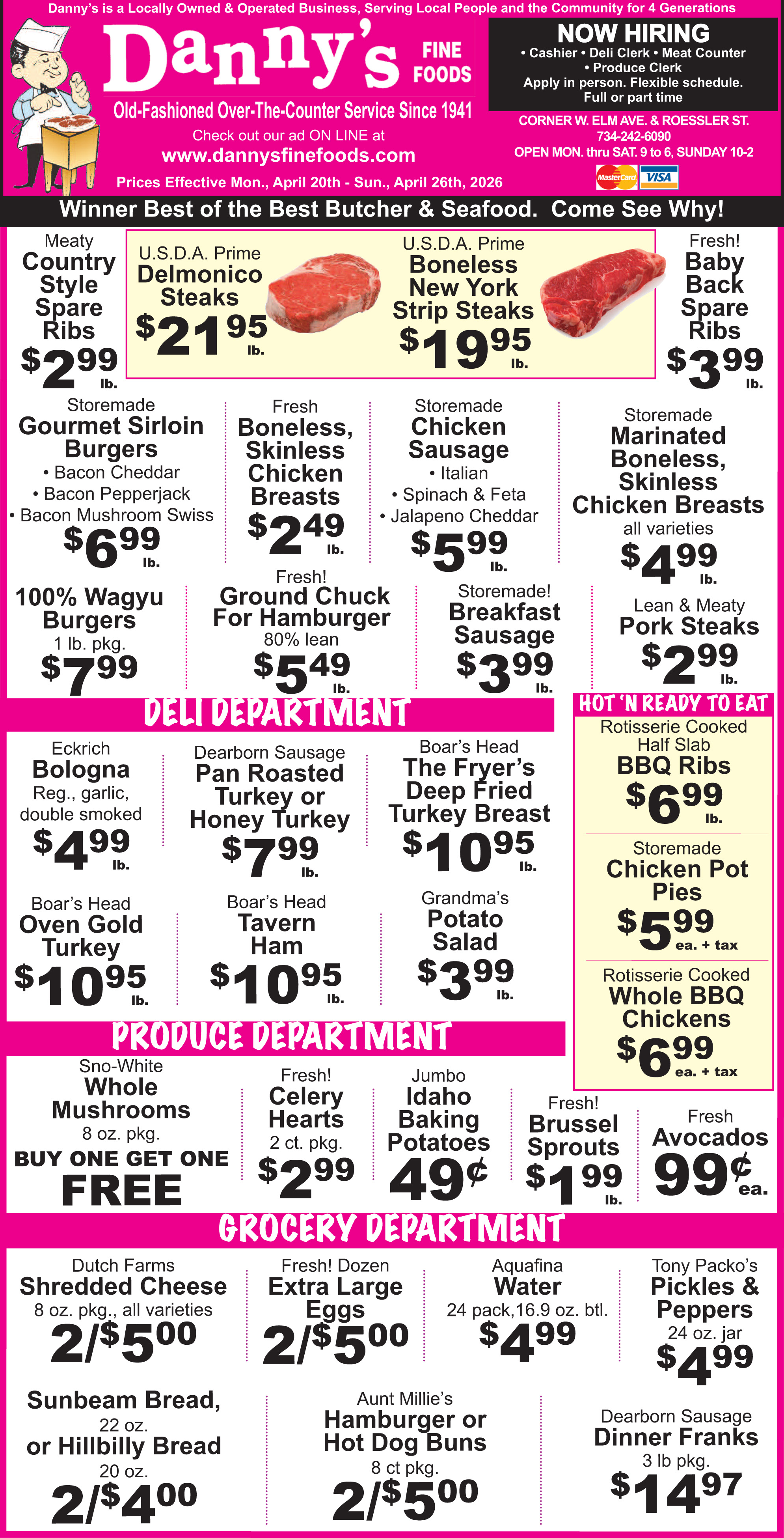 Weekly specials April 20th – April 26th . Back is Danny’s own Chicken Sausage Spinach Feta and Italian!